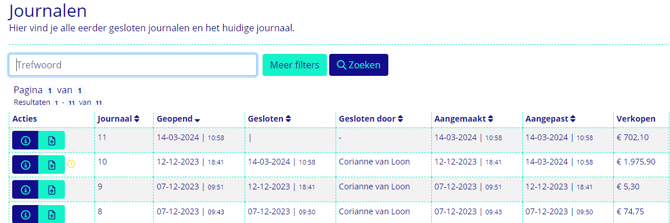 Je kunt alle gesloten journalen bekijken en afdrukken via Rapportage > Journalen. Klik in het overzicht op de "i" om het journaal te openen. Wijzigen maken een in journaal dat al definitief is gemaakt is niet mogelijk.