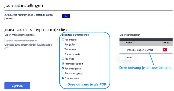 - Vink de gewenste overzicht(en) aan, en kies indien gewenst ook een rapportage om als .csv bestand te ontvangen