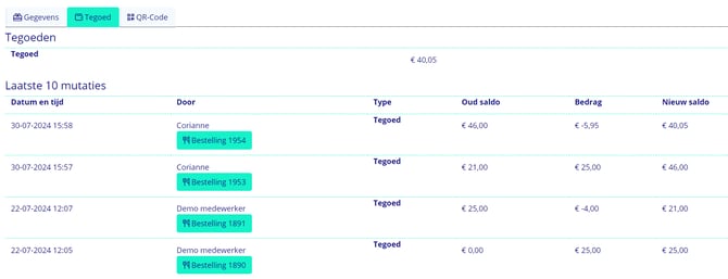 - Klik op de "i" om de details van de kadokaart te zien, en kies het tabblad "Tegoed". Je ziet hier het huidige saldo en de laatste 10 mutaties op deze kadokaart.