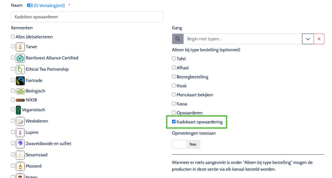 - Maak een menukaartsectie aan op een bestaande of een nieuwe menukaart, en stel het type in op "Kadokaart opwaardering"