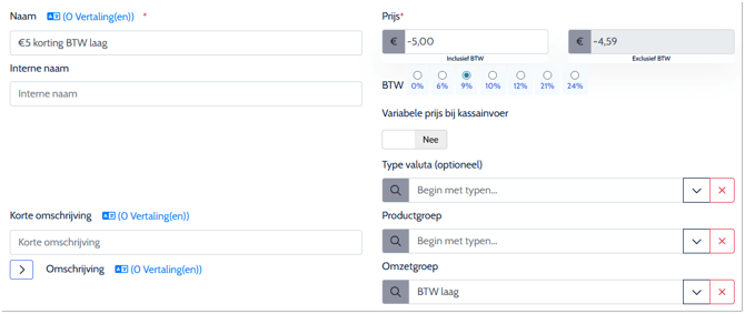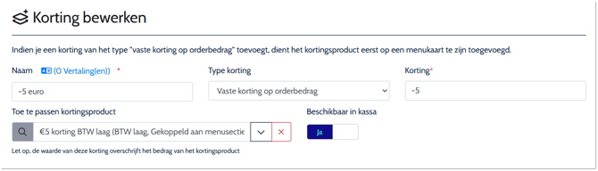 2. Vul het kortingsbedrag in, en kies het eerder aangemaakte kortings product