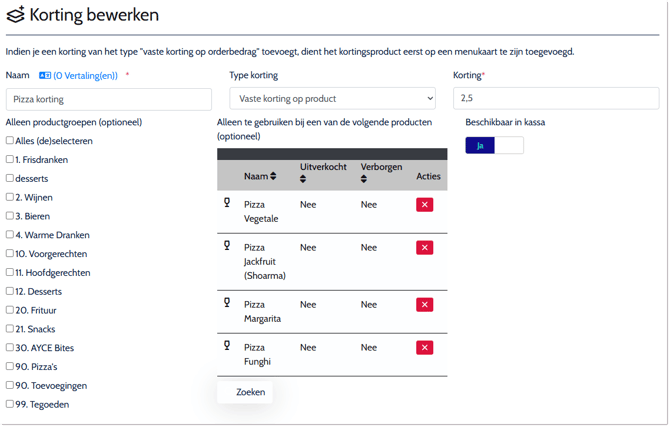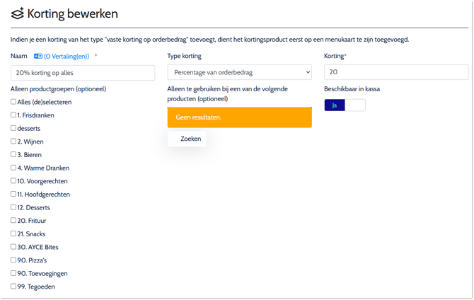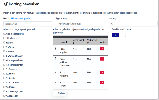 • Vink eventueel één of meerdere productgroepen aan. Deze korting wordt dan alleen toegepast op producten uit deze groep(en). Als je geen productgroep aanvinkt, wordt de korting op alle producten uit de bestelling toegepast.