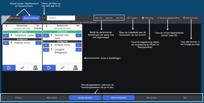 - Keuze tussen Uitgiftescherm en Keukenscherm